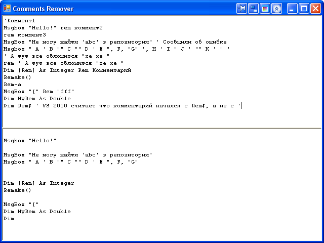 Хакер писал(а):FireFenix писал(а):Регуляркой, от ' до vbCrLf и от rem до vbCrLf?