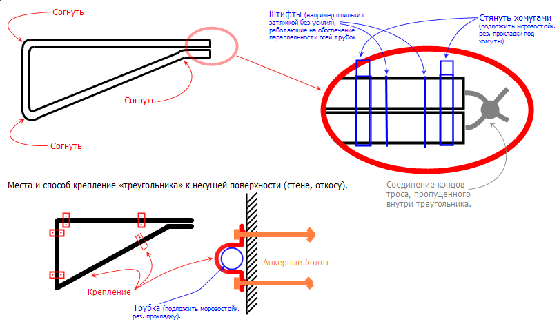3. Если конструкция будет изготовлена так, что внутрь трубки сможет приникать влага, рекомендую заполнить внутренность трубки монтажной пеной (делать это нужно разумно, чтобы трубу не разорвало изнутри, и конечно, после того, как трос будет пропущен). В противном случае не исключён вариант, когда замерзшая скопившаяся внутри вода разорвёт или просто деформирует (с понижением её прочности) трубку.