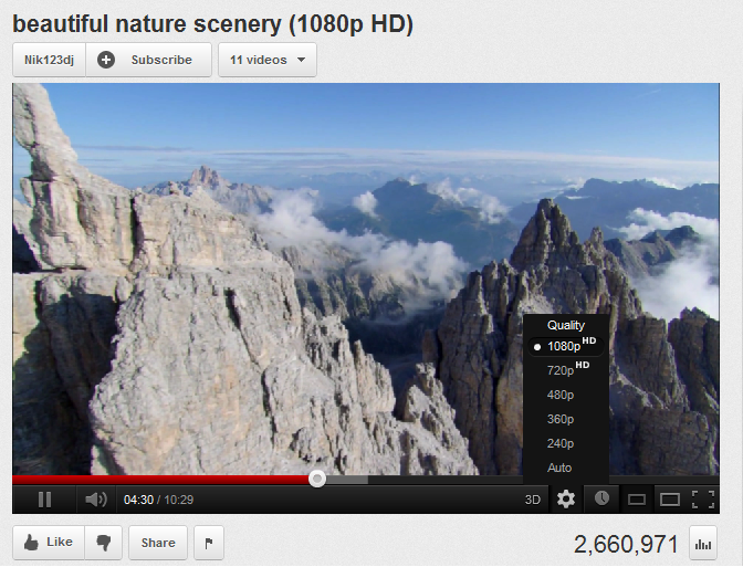 Свободно смотрю ролики в 1080p. Однако, последнее время стал наблюдать на ютубе странные явления "подвисания", когда после перемещения ползунка позиции на еще не подгрузившийся участок ползунок какое-то время висит на новой позиции, а потом перескакивает обратно, возобновляется воспроизведение с прежней позиции и через какое-то время внезапно происходит перескок ползунка на новую позицию и начинается подгрузка. Если сделать несколько таких перемещений подряд, то дальнейшие приключения ползунка могут привести к полному зависанию плеера