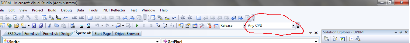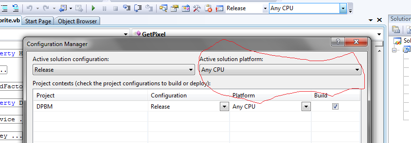А если есть во вкладке Compile вверху выпадающие списки Configuration и Platform. Попробуй там поменять на x86.