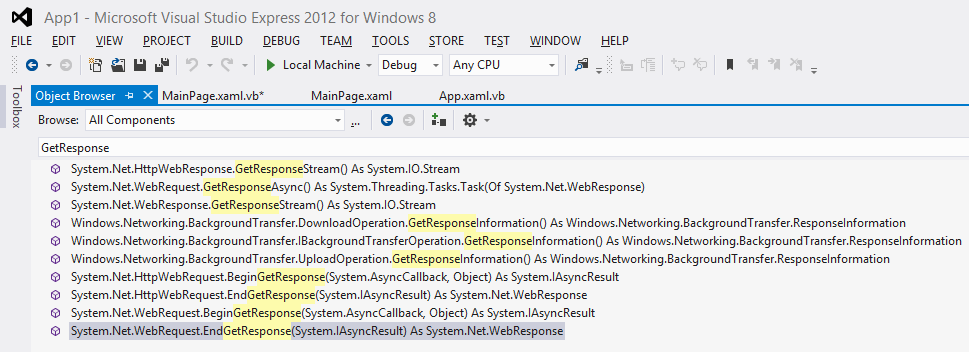 kaktuz писал(а):в HttpWebRequest нету функции GetResponse!!! Есть GetResponseAsync, но как ее использовать - ума не приложу...